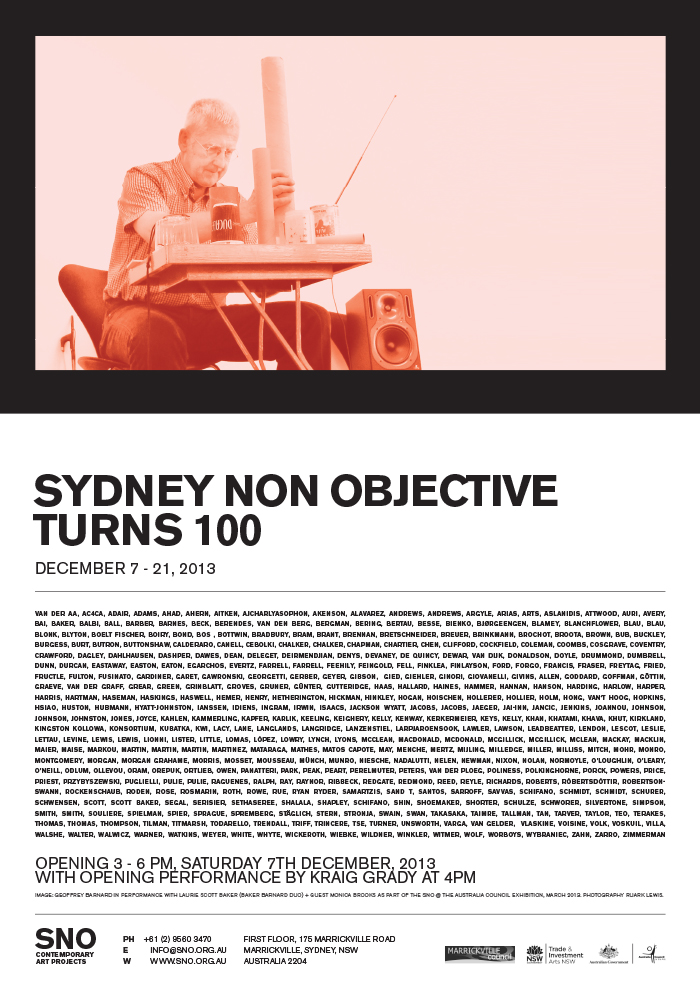 SNO 100 features work by over 300 artists from all over the place who have been involved in the last 99 SNO exhibitions. To be opened by eminent artist and writer, Emeritus Profesor Richard Dunn and featuring a sound performance by Kraig Grady and Terumi Narushima.